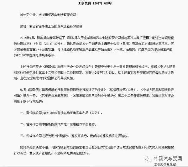 去年9月,财政部公布了骗补的五家车企名单,并对涉事企业进行了处罚。而今年春节才过,政府就又打出了一记重拳。日前,工信部发布了行政处罚决定书,公布了对金华青年汽车、上汽唐山客车、重庆力帆、郑州日产、上海申沃、南京特种汽车、重庆恒通7家骗补车企的行政处罚决定。